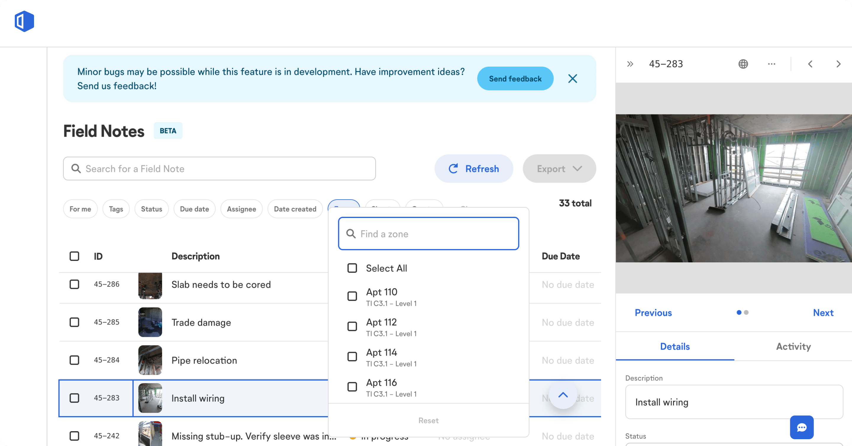 - Improved Field Coordination with Field Notes Zones and Field Notes Explorer: Zones allow notes to be categorized by project areas, such as rooms and sectors, or by project phases. Field Notes are automatically tagged with their respective Zones and displayed on corresponding sheets for easy filtering and progress monitoring. Site and org admins can create, edit, copy, and delete Zones via the "Zones" tab in project settings. Field Notes Explorer enhances issue management with features like bulk status adjustments, task assignments, and report generation.